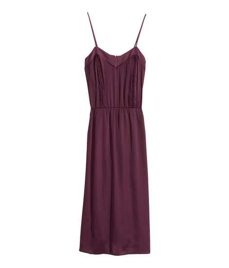 CONSCIOUS. Calf-length satin dress with narrow shoulder straps, pin-tucks at the front, an elasticated seam at the waist, and buttons at the back. Unlined.